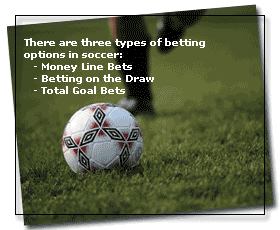 There are three types of betting options when betting on soccer. The bettor can bet on a money line for his team to win, a money line for the draw, or he can bet on the total score of the game.